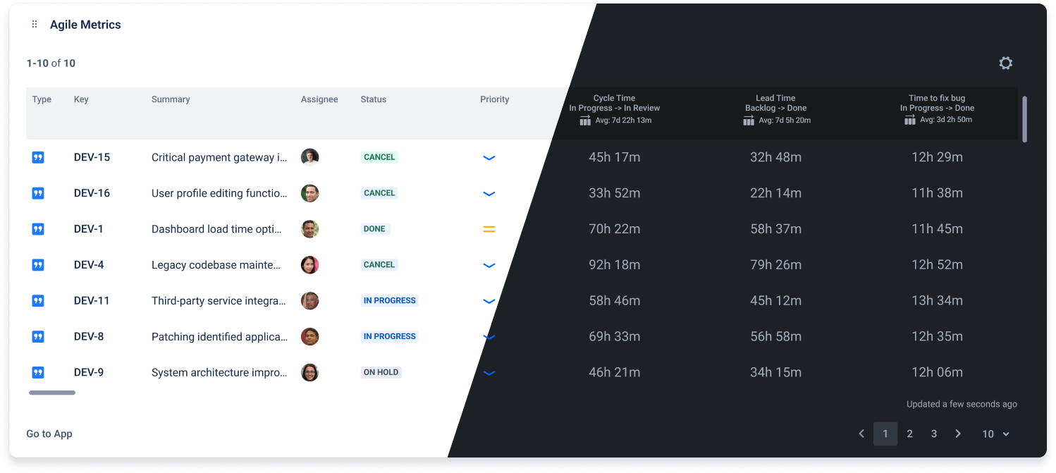 Agile Metrics Dashboards enables Jira users to monitor customized time metrics reports using data from the Time Metrics Tracker app on the Jira dashboard. It also supports dark mode.