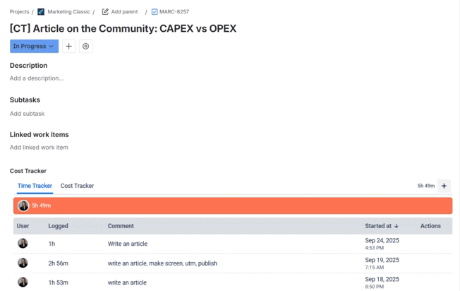 The Time Tracker widget seamlessly integrates into the Work Item page, allowing you to efficiently log the time spent on your most significant tasks throughout the day. It allows users to log new worklogs, view all entries, and manage existing time logs (edit or delete). Logged data is automatically included in cost analysis, forecasts, and reports.