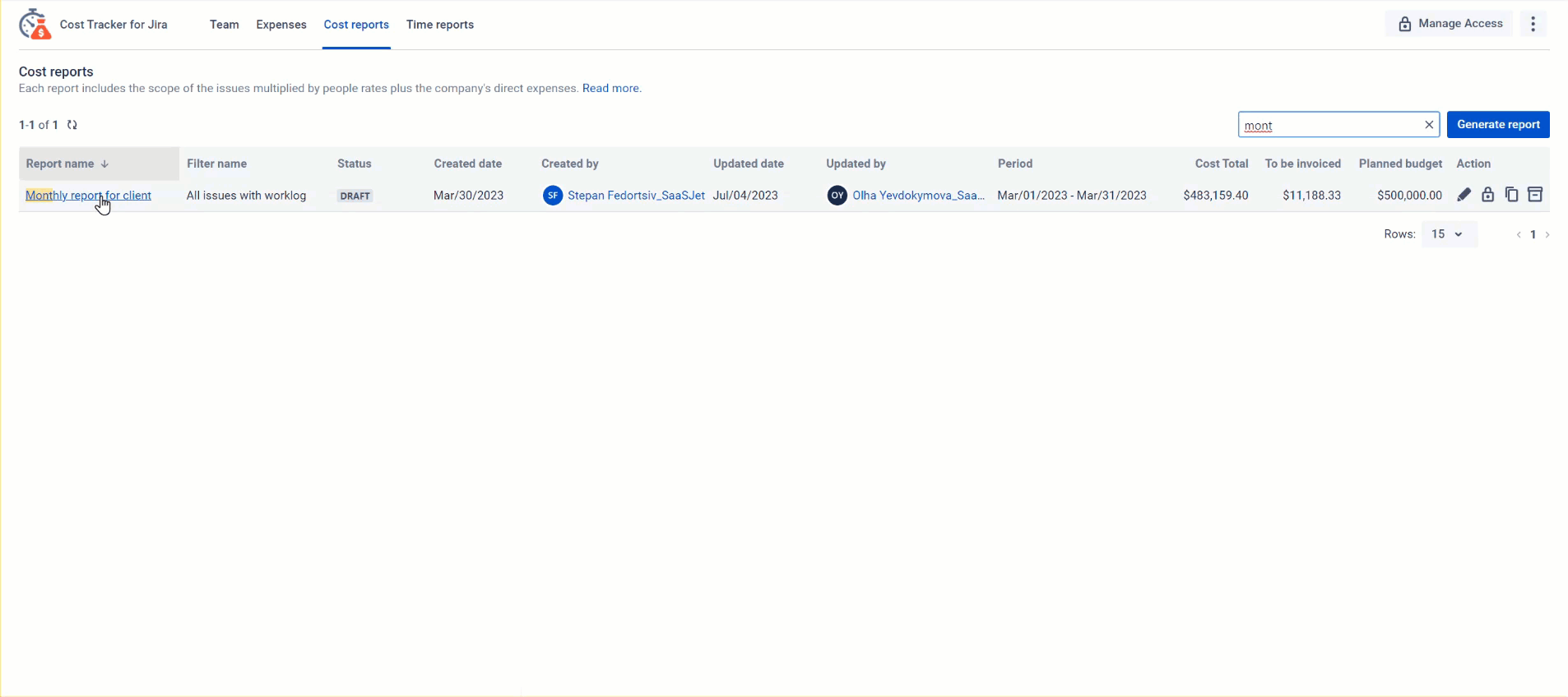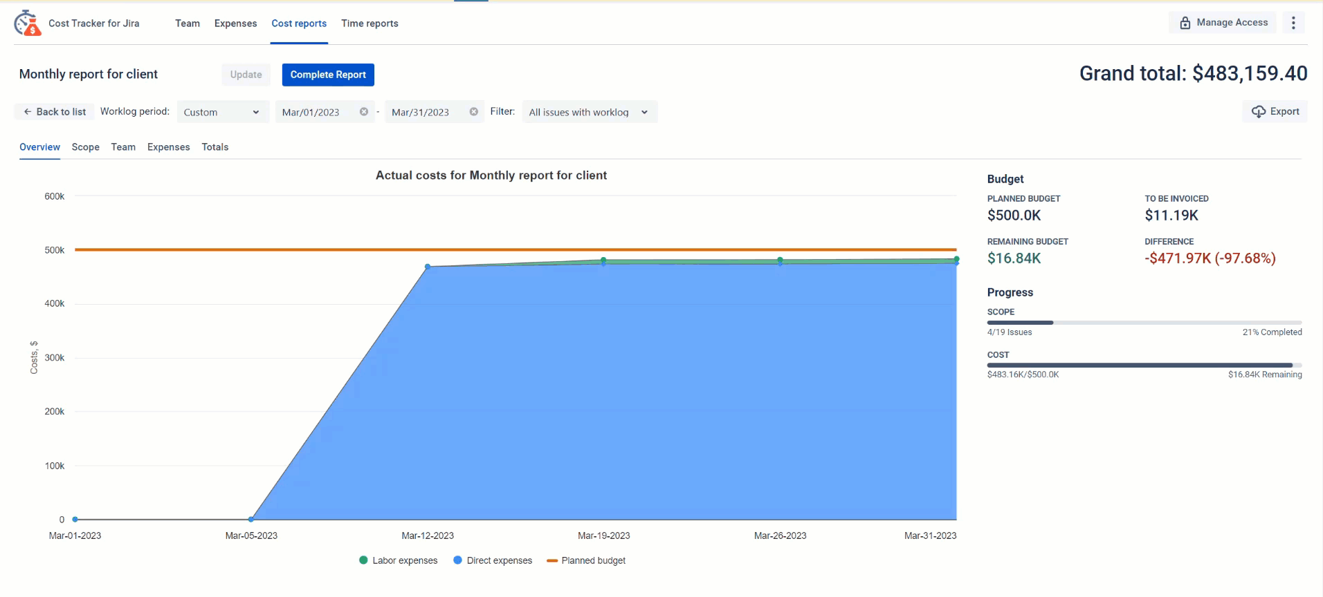 Get immediate insights of your project cost (labor cost and expenses) compared to your planned budget using the charts view for your reports.