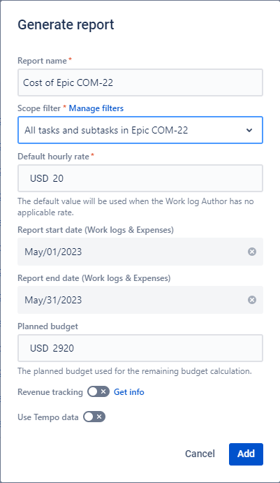 Go to the Cost Tracker app in the Cost Reports tab, and click the button Generate report. Enter the name of the report, select the newly created filter, set the default hourly rate (it will be applied if one of the team members does not have a pre-entered hourly rate), the required period, and the Planned budget parameter - the total planned cost allocated to a specific epic. You can leave the Planned budget blank - it is not required.