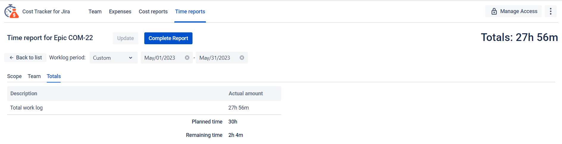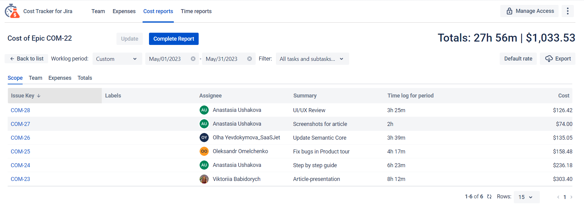 Next, you get an informative Cost Report, where you can see the cost of each task and the epic as a whole. The report also includes the expenses that accompanied the team's work on the epic. If you fill in the Planned Budget field, you can see whether you exceeded the limit.