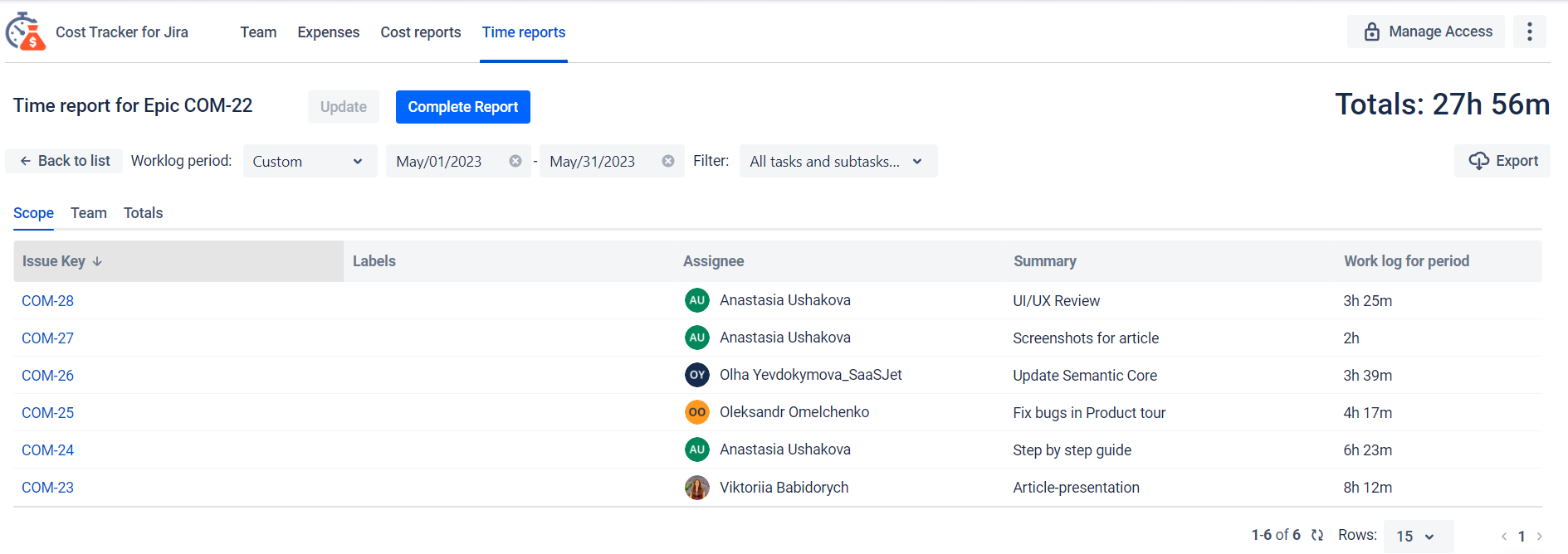 Using the JQL filter created for the epic, you can generate a Time Report using the same algorithm in the Time &Cost Tracker app. You will receive a time report with a breakdown by tasks, teammates, and total workflow values.