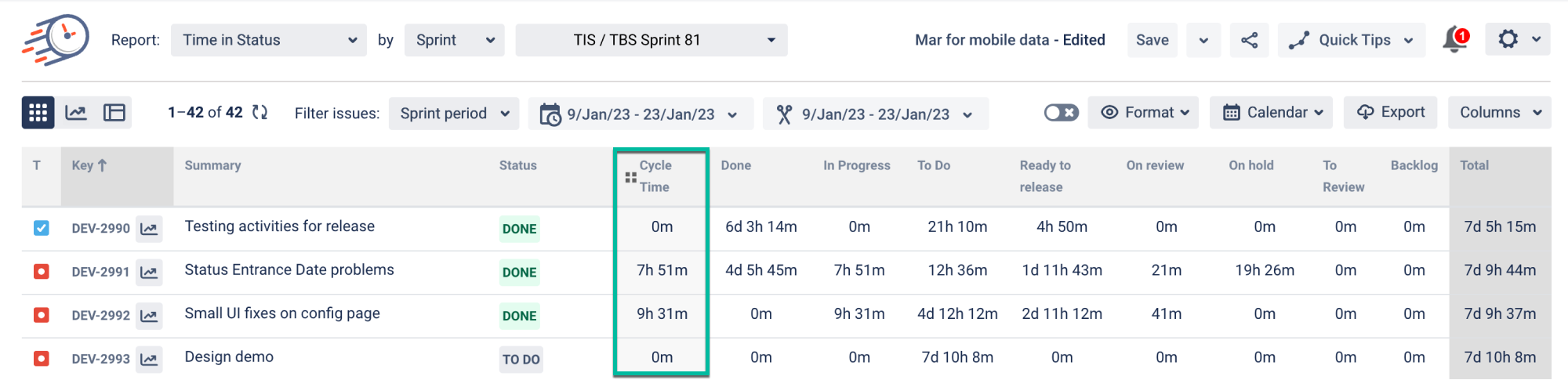 π Outcomes: With Time in Status, you can monitor Cycle and Lead time for each issue, identify bottlenecks in your workflow, and track team performance. You can also export the data to Excel or Google Sheets (XLSX or CSV formats) for further analysis or sharing with stakeholders. This way, you can ensure that your team meets deadlines and maintains project flexibility. |