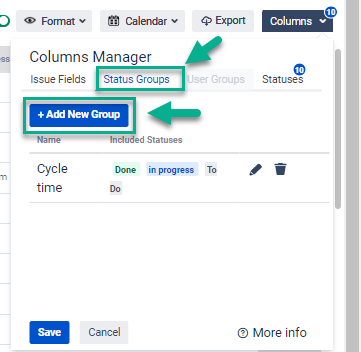 Time in Status lets you get Cycle and Lead time by setting the Status Groups. You can configure it in the Column Manager with the statuses drop-down list. You can choose the statuses you want to include in Cycle or Lead Time in your workflow.