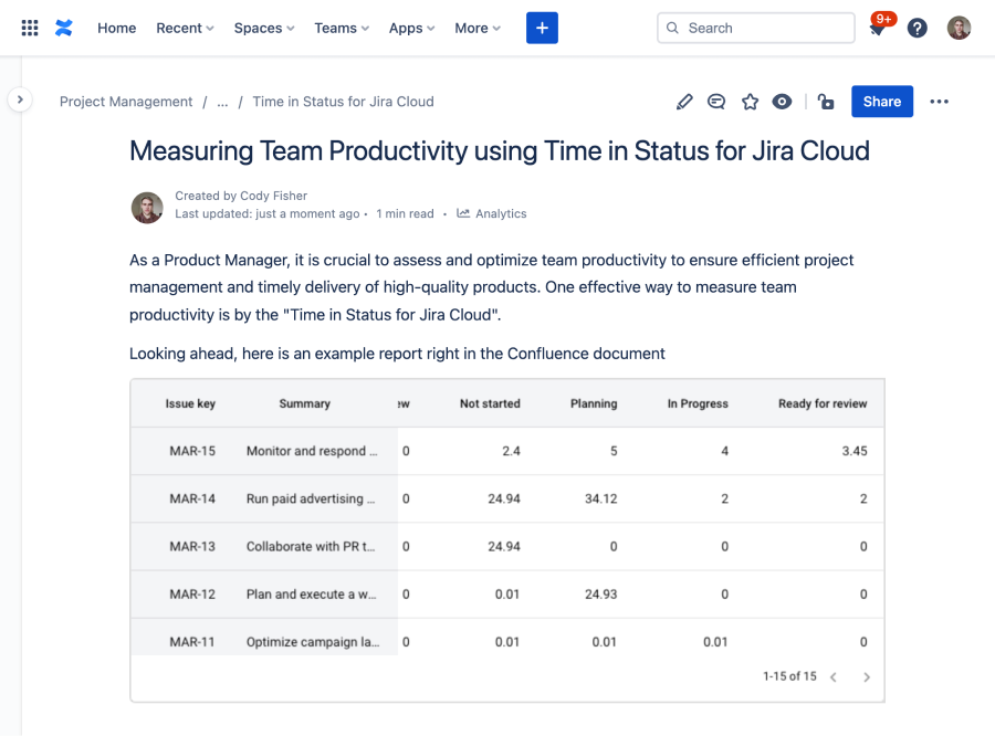 View of the report with time-in status on the Confluence page