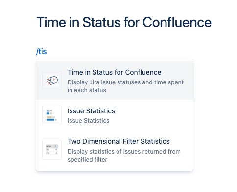 The Time in Status in Confluence macros allows users to upload reports from the Time in Status app to the Confluence page.