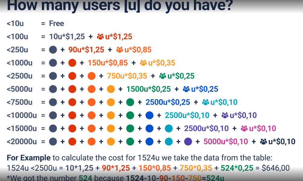 When you calculate a price for a particular amount of users, you need to divide this number so that each part of it regards an exact tier. To calculate the price for your users (if there are more than 100), you need to calculate the price for each tier separately and sum them to get the final price. Look at the precise example in the picture above on how to get the necessary data.