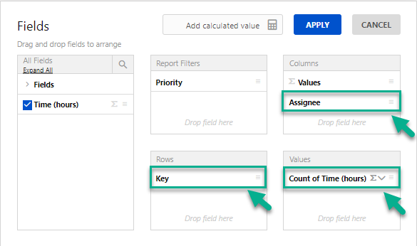 Choose Count of Time (hours) from the drop-down list in the Values column.