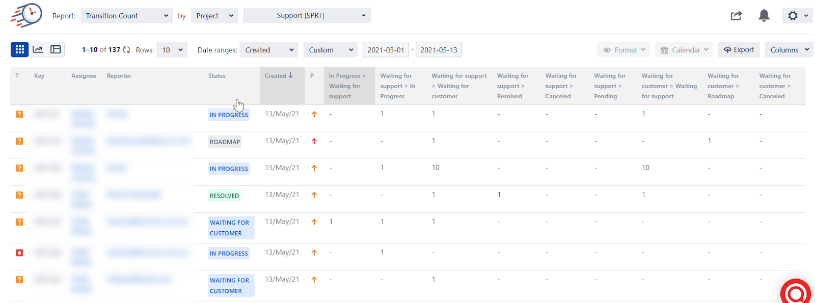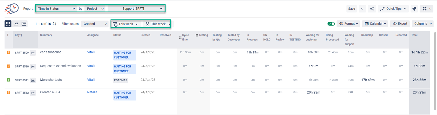 So you will get a detailed view of the time values which the support issues were spent in each status of the workflow. This report helps to overview the statuses where we have time overlimit, and where our bottlenecks occur.