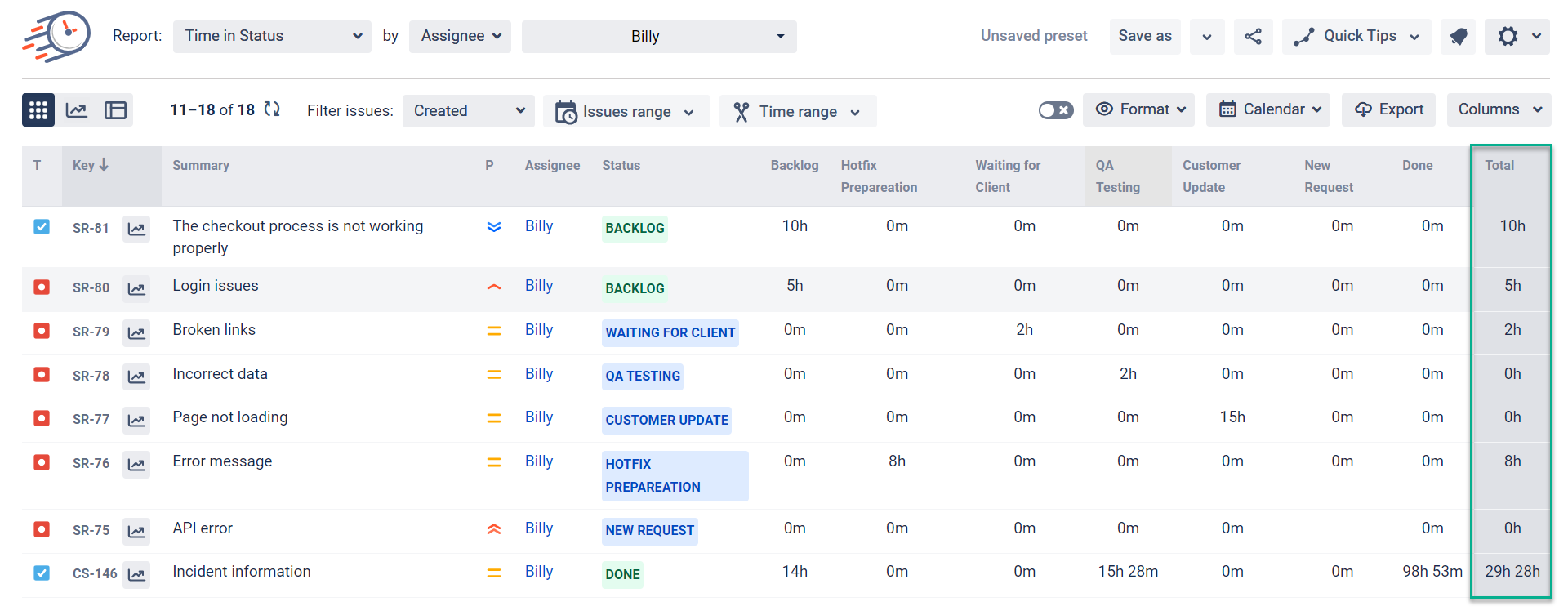 Now in the Total column, you can monitor the total time the chosen issue has been staying in each status.