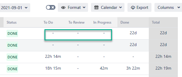 🤔 User Problem: Users see “–” in the "Time in Status" column for many line items in their report, even though the actual Jira ticket shows an actual Time in Status for "In Progress". They need to understand why this happens and how to fix it. |