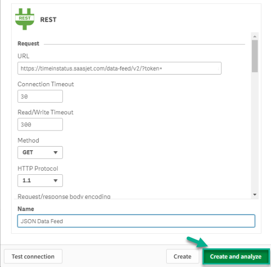 5. Paste JSON Data Feed link and name it as you wish. Click the “Create and Analyze” button to start processing.