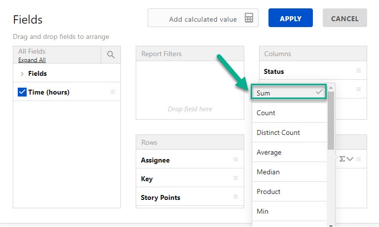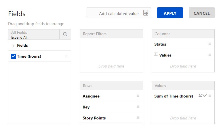 In the Field menu, you can customize data presentation by setting your custom fields for Rows, Columns, Values.