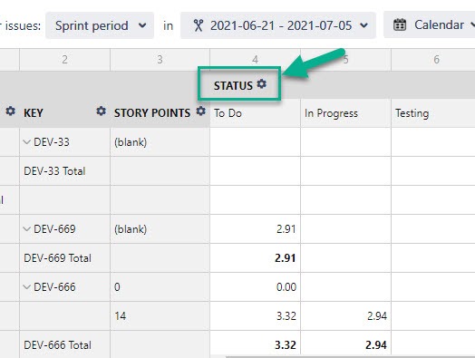 7. Click the gear to filter statuses when assignees are working on issues, according to your workflow, and apply it. Lets’ take “In Progress” as an example.