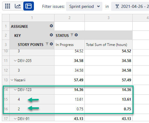 Now, you can compare how much time each team member has spent on issues and how many story points are closed.