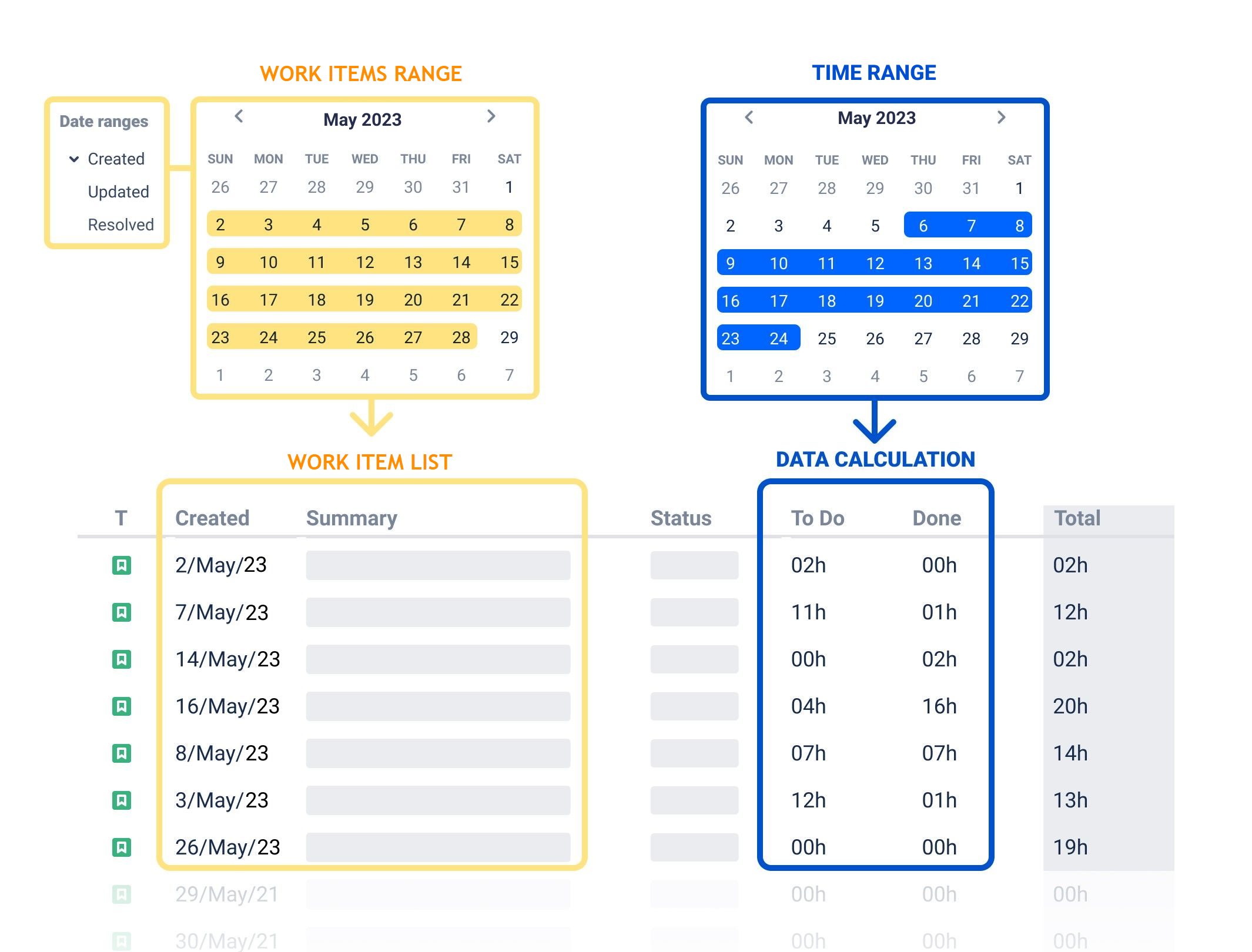 The dates in the “Time range” can not be earlier than the “Work Items range“ dates. And if the future dates are selected in the “Time range”, no data will be displayed.