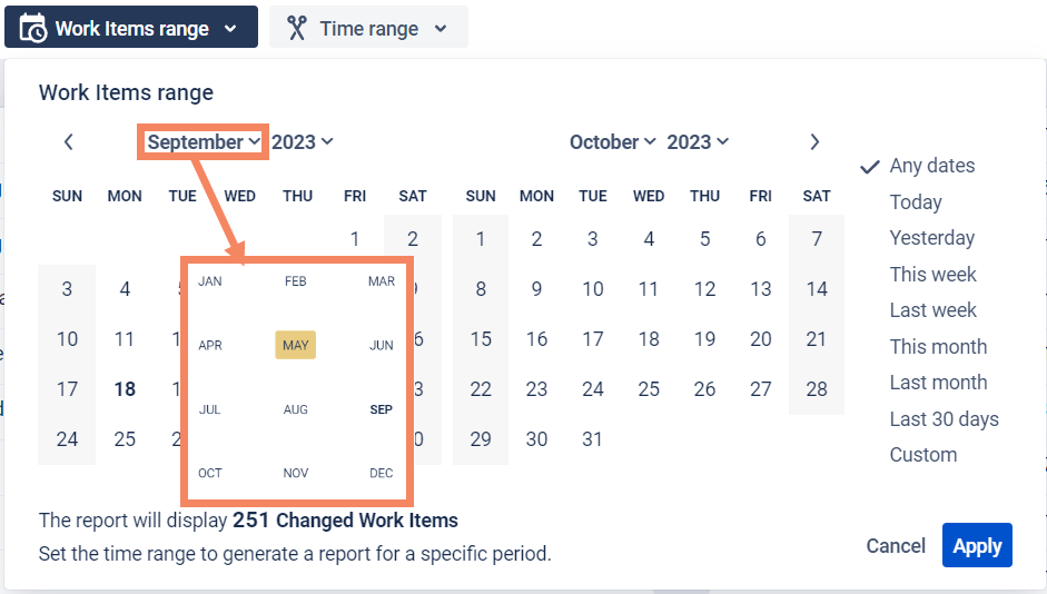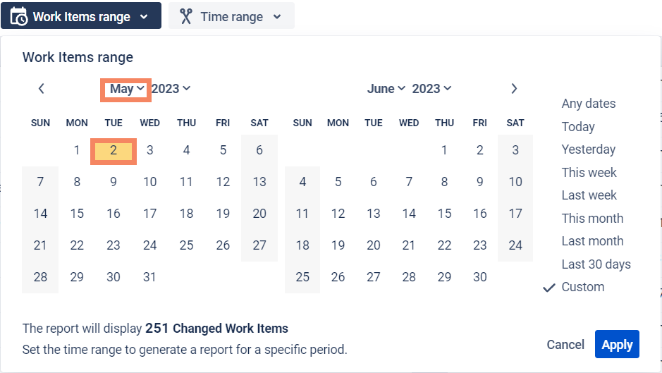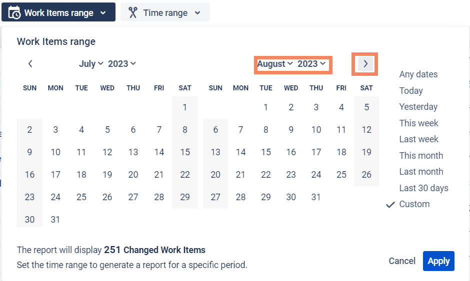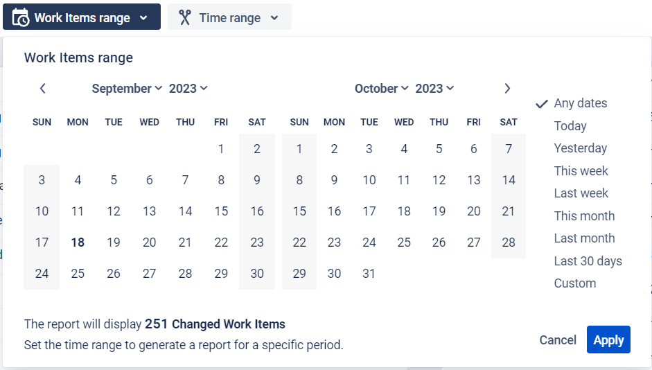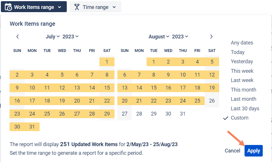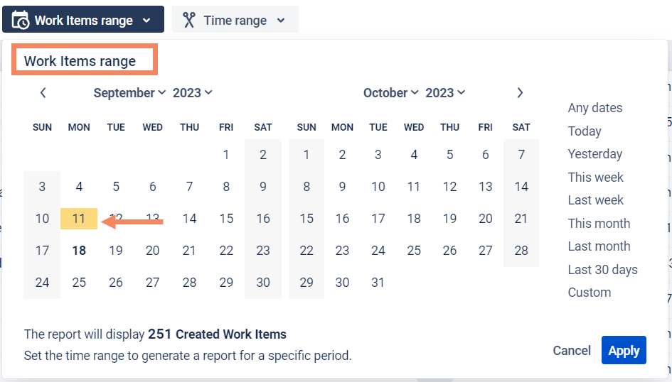 Click on the “Work Items range” or "Time range" button. The calendar will be displayed.