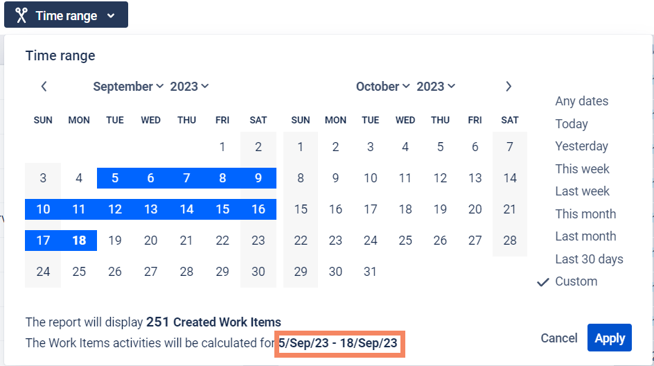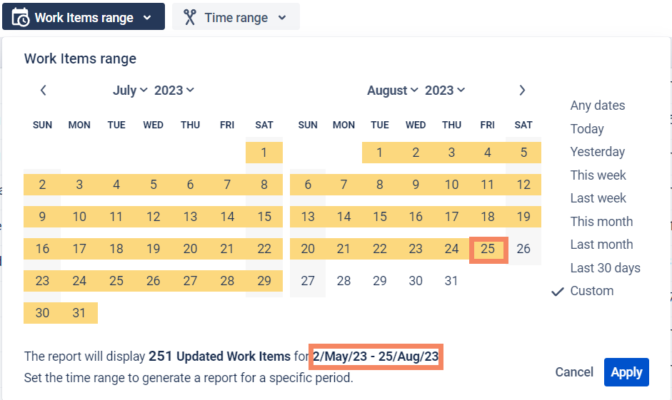 When you click Apply on the “Work Items range ” calendar, the selected “Work Items range ” will be highlighted with a yellow color, and you’ll get a sample of Work Items that have been created/changed/closed during the chosen period.