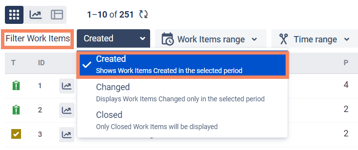 Choose the Created, Changed, or Closed item from the drop-down menu to filter the list of issues.