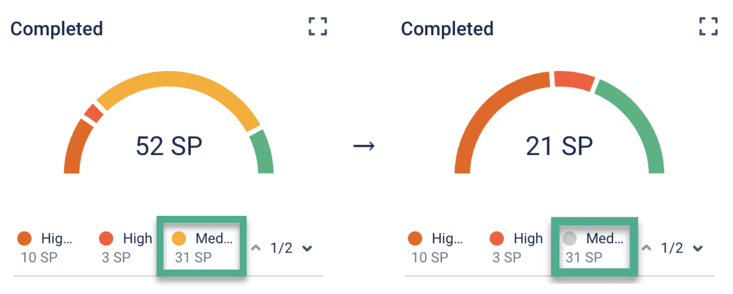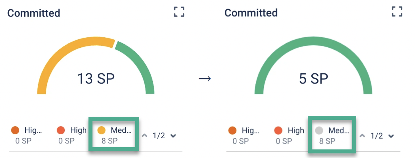 Committed – issues the team has committed to completing within the specific sprint. There are the tasks, subtasks, user stories, or backlog items that the team has planned to work on during the sprint and are part of the sprint's scope. These tasks were in any status on the board at the start of the sprint, except for the rightmost one.