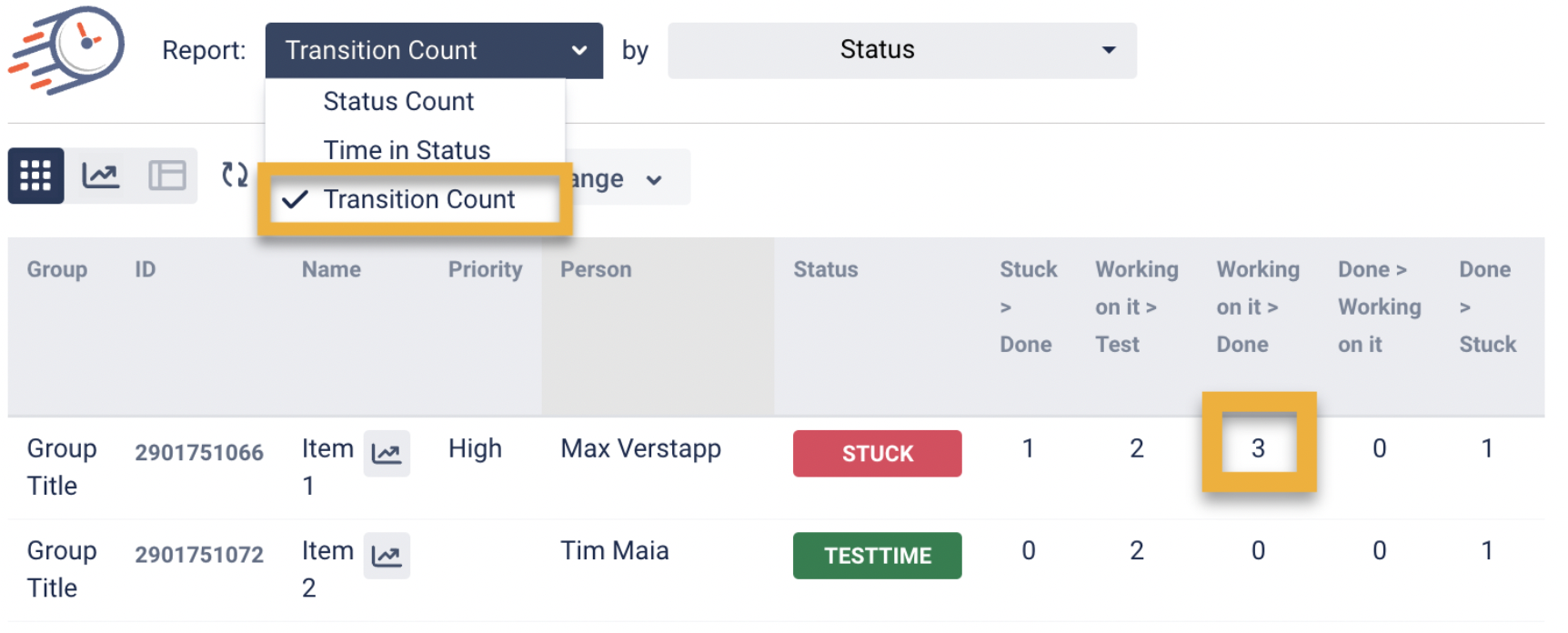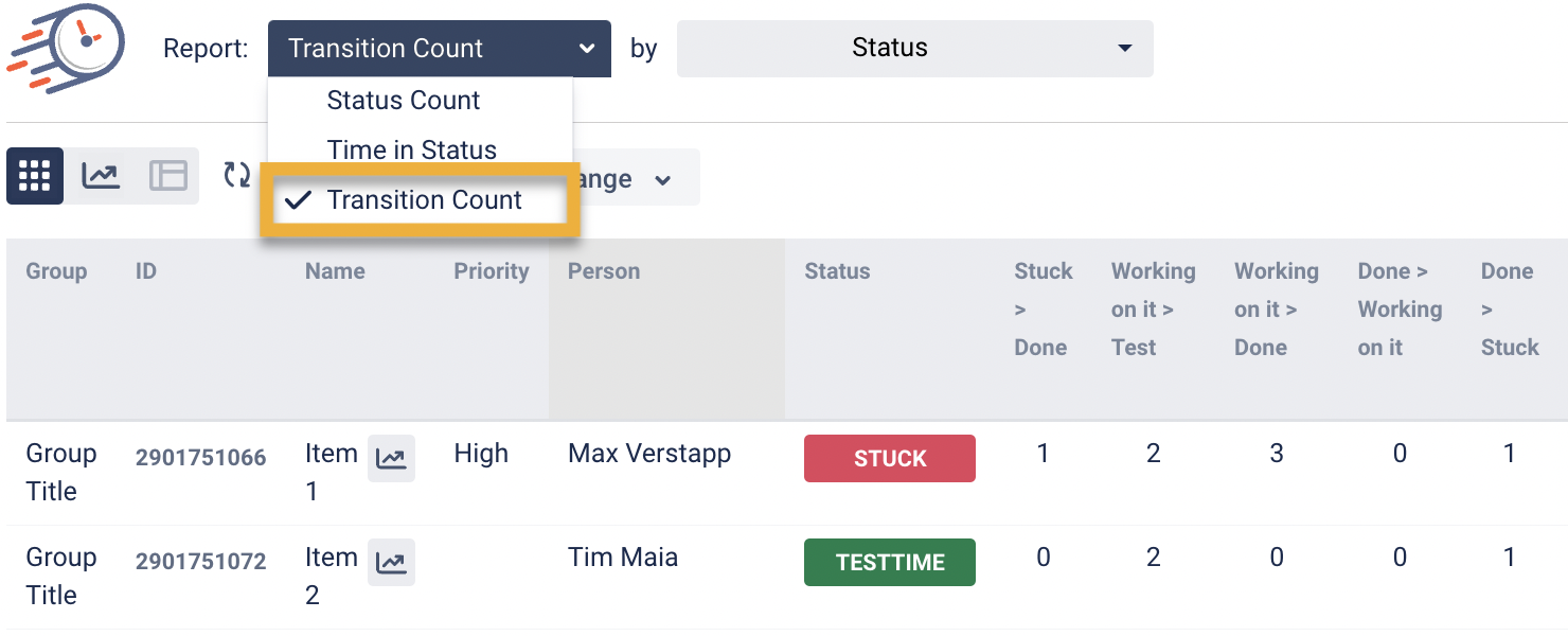 For example, the Item was in the Working on it status, then moved to the Done status. So, the transition count between Working on it and Done status is 1. Then the Item moved to other status and after a while, the Item returned to the Working on it status, then moved to another status is 2, and then moved back to Done. So the transition count between Working on it and Done status is 3.