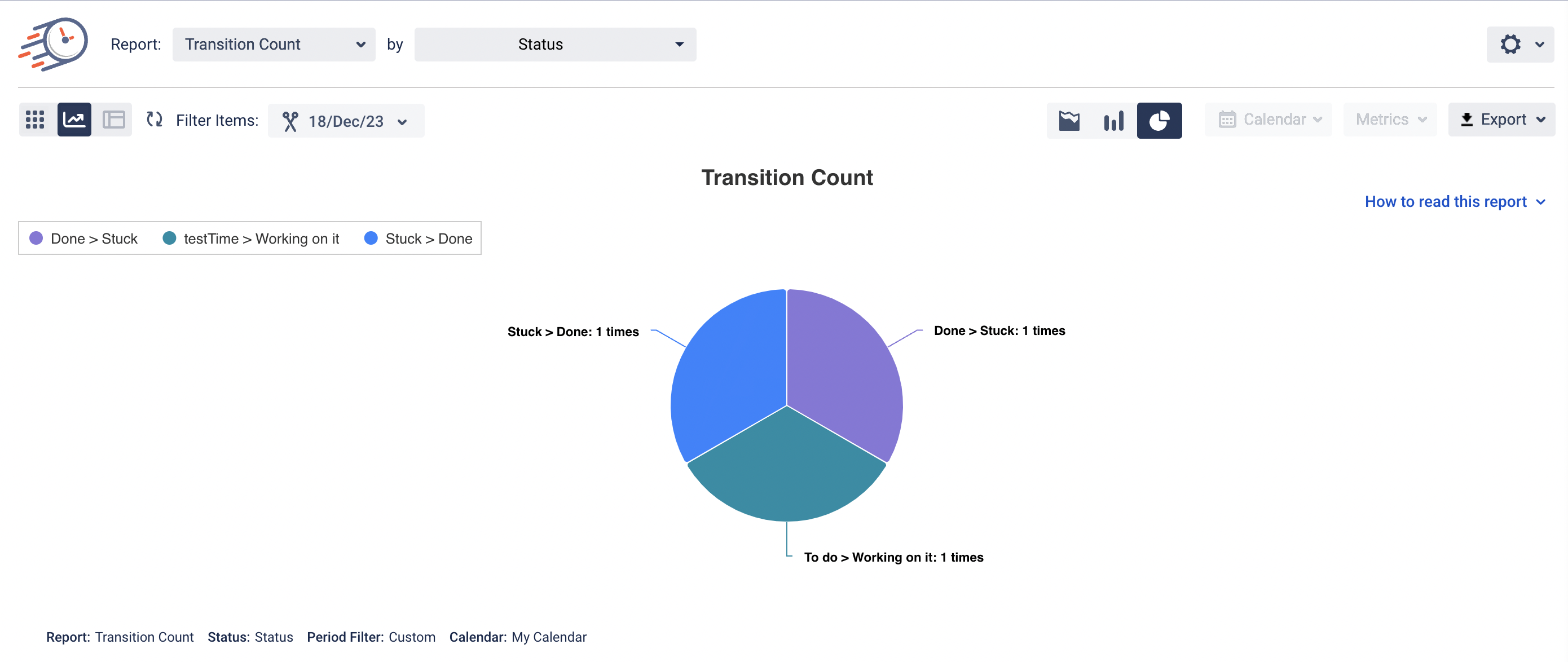 The calculation of the report on the Chart view occurs according to the selected period. The transition count report calculates the number of transitions between status for the Items in the chosen period.